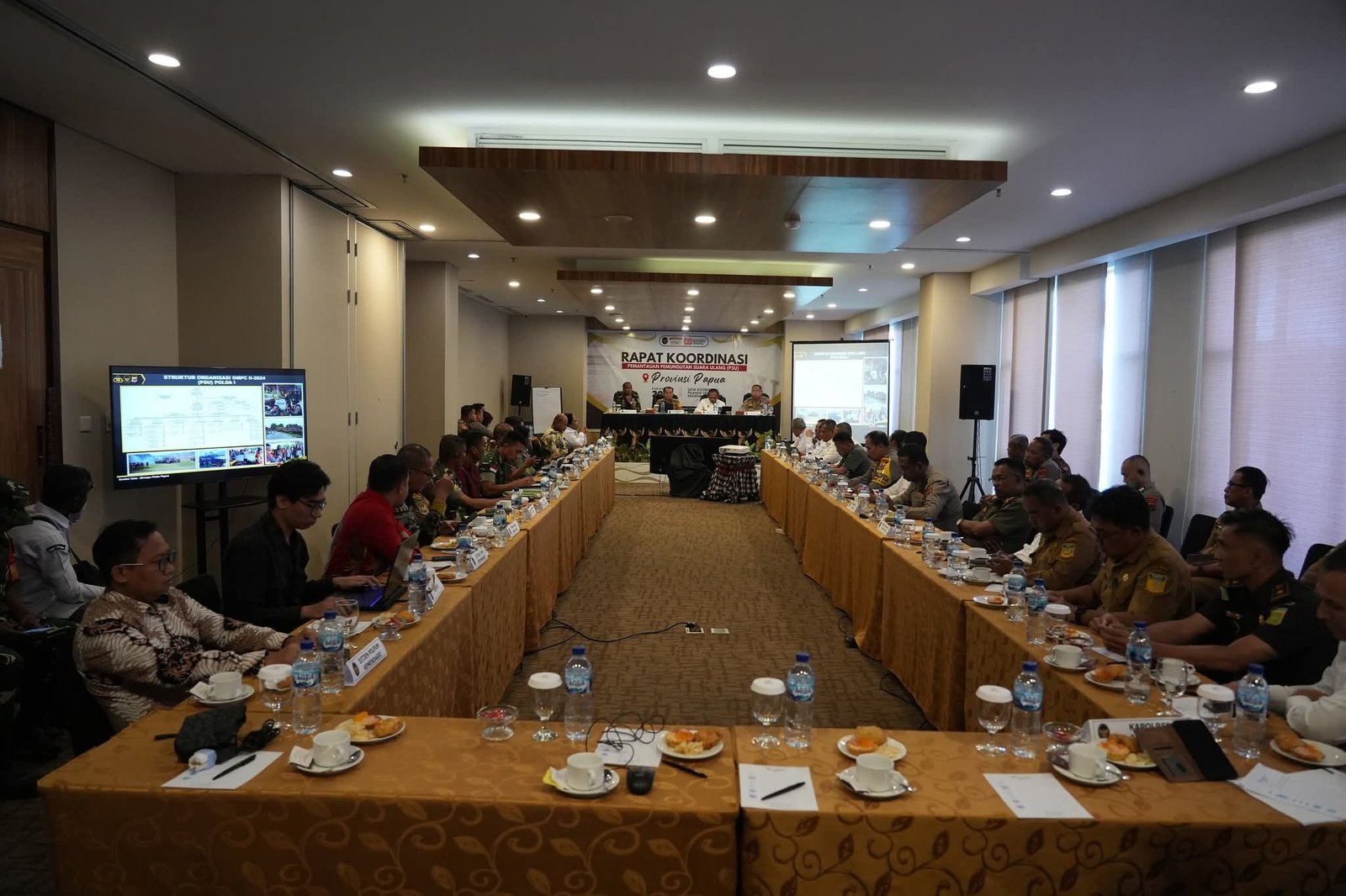 Rakor Kesiapan PSU Papua dihadiri pejabat dari berbagai lembaga terkait. Antara lain PJ Gubernur Papua, Wakapolda Papua, Kabinda Papua, Ketua KPU dan Ketua Bawaslu Papua.
