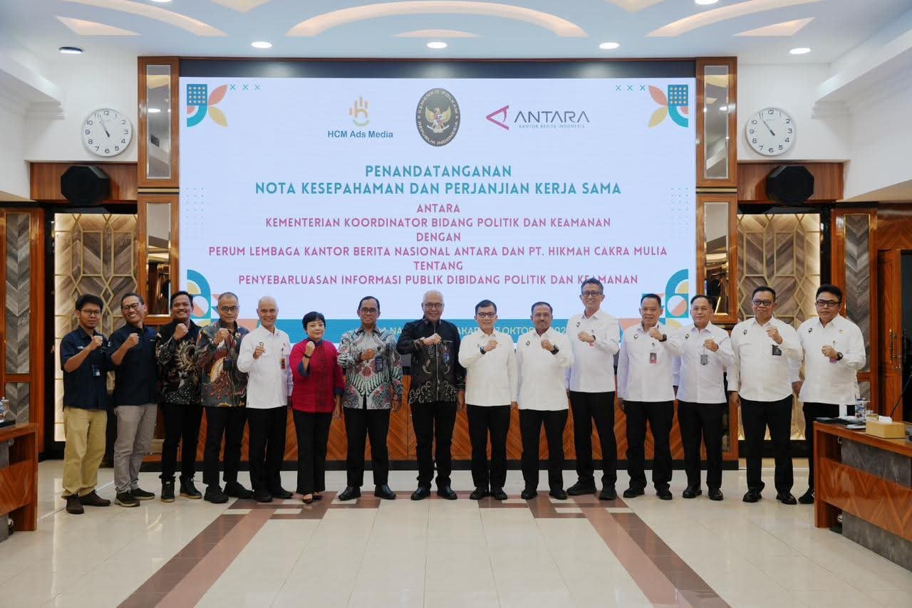Jakarta, portalbabel – Kementerian Koordinator Bidang Politik dan Keamanan melaksanakan penandatanganan Nota Kesepahaman dan dan Perjanjian Kerja Sama dengan Perum Lembaga Kantor Berita Nasional (LKBN) Antara dan PT Hikmah Cakra Mulia tentang Penyebarluasan Informasi Publik di Bidang Politik dan Keamanan.