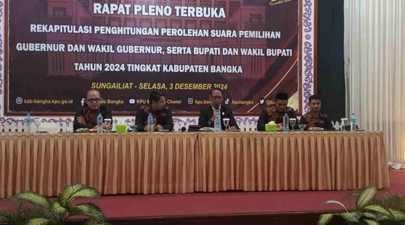 Sungailiat, portalbabel — Komisi Pemilihan Umum ( KPU) Bangka menggelar Rapat pleno terbuka rekapitulasi perhitungan perolehan suara pemilihan gubernur dan wakil gubenur serta Bupati dan wakil Bupati tahun 2024 di tingkat kabupaten Bangka yang dilaksanakan di Gedung Aurora Hotel Tanjung Pesona, Sungailiat ( 3/12/2024).