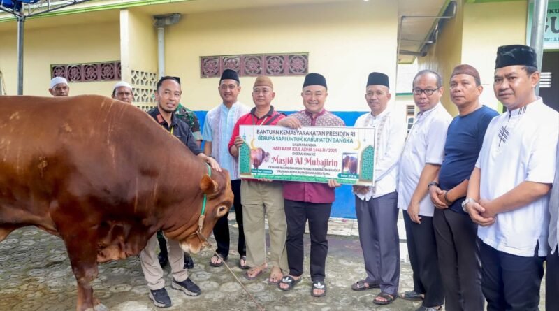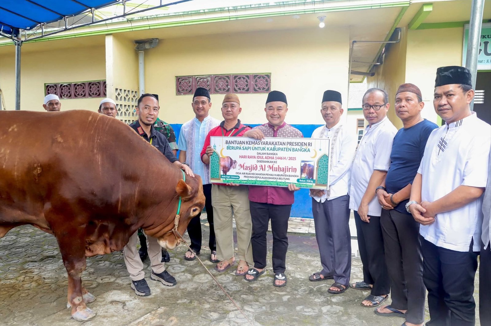 Bangka, portalbabel — Pj Bupati Bangka Jantani Ali menyerahkan Sapi kurban bantuan Presiden RI, Prabowo Subianto ke panitia kurban Masjid Al Muhajirin Desa Air Ruay Bangka, Provinsi Kepulauan Bangka Belitung Sabtu.( 07/06/2025).