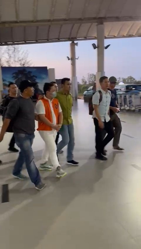 Setelah tiba di Bandara Depati Amir Pangkalpinang pada pukul 17.58 WIB, Yandi yang dalam kondisi tangan terborgol langsung digiring oleh tim kejaksaan menuju mobil minibus.
